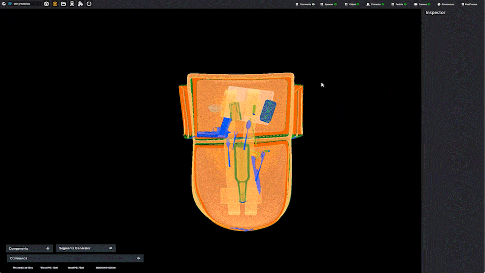 수하물 내부에 디지털 트윈으로 구현된 위험물 객체를 배치하여 다각도 뷰와 실시간 자동 라벨링 기능으로 가려짐 문제를 해결하고 대량의 고품질 학습 데이터를 생성합니다.